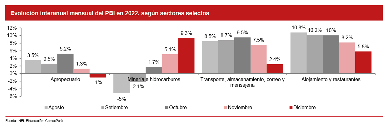 Es importante enfatizar que, durante los últimos meses del año, la evolución en algunos sectores mantiene cierta tendencia. Por ejemplo, con excepción de octubre, el sector agropecuario acumula una pérdida de dinamismo desde agosto, que se sustenta en la menor disponibilidad de insumos y la escasez de agua hacia el cierre del año. Por su parte, los sectores transportes y comunicaciones y alojamiento y restaurantes comenzaban a perder dinamismo, pero esto se agudizó en diciembre, motivado por las acciones subversivas detrás de las protestas, el bloqueo de carreteras y la pérdida de atractivo turístico.