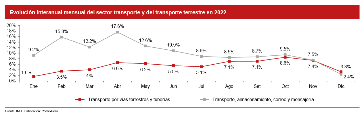 Por otro lado, es importante enfatizar que las acciones subversivas limitaron el desempeño del sector transporte, sobre todo el terrestre, debido a los bloqueos de carreteras. De acuerdo con el INEI, el subsector transporte por vías terrestres y tuberías acumuló un crecimiento del 5.7% durante enero-diciembre. Esto se explicó por el mayor dinamismo durante la segunda mitad del año, cuyos resultados mitigaron la caída del sector transporte, almacenamiento, correo y mensajería. En noviembre, el transporte terrestre aumentó un 7.4% con respecto al mismo mes de 2021, pero en diciembre solo lo hizo en un 2.4%, cifra que representó el segundo menor crecimiento de este subsector, a pesar de la tendencia al alza que mantuvo durante la mayor parte del año.
