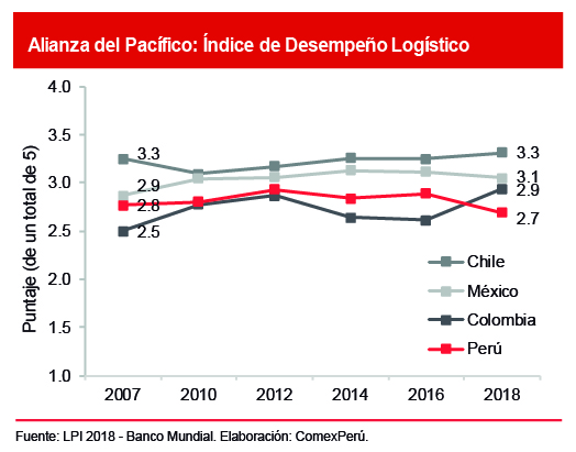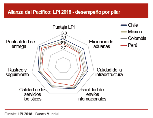 De acuerdo con el reporte, las falencias de nuestro país se encuentran precisamente en los pilares clave de la logística, es decir, aquellos relacionados a las áreas de regulación de políticas. En 2018, el puntaje más bajo lo obtuvo en el pilar “Calidad de la infraestructura”, seguido por el de “Eficiencia y calidad de los servicios logísticos” (transporte, reenvío e intermediación aduanera). Asimismo, las cifras agregadas para el periodo 2012-2018, muestran que nuestro desempeño más bajo se encuentra en el pilar “Calidad de la infraestructura”, seguido por el de “Eficiencia en la gestión y trámites de aduanas”. No sorprende, pues, que ello se condiga con los resultados del Índice de Competitividad Global del Foro Económico Mundial, en el que ocupamos el puesto 111 (de un total de 137 economías) y el 75 en calidad de la infraestructura y carga de procedimientos aduaneros, rezagado entre los países de la AP.