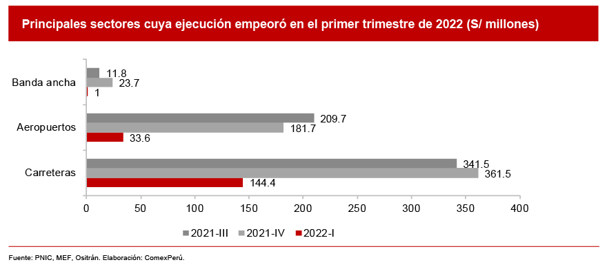 Esta caída en la ejecución trimestral se debió principalmente al menor rendimiento de los sectores carreteras, aeropuertos y banda ancha. En el caso de los dos primeros, su ejecución en los dos últimos trimestres había sido notoria, pues entre ambos representaban un poco más del 50% de la ejecución total. No obstante, en el primer trimestre de 2022, la ejecución del sector carreteras cayó un 60%, mientras que la ejecución del sector aeropuertos, un 81.5%. Como resultado, en conjunto, representaron solo un 27.4% del total ejecutado en dicho trimestre. En cuanto al sector banda ancha, este experimentó la mayor caída en su ejecución trimestral: 95.6%.
