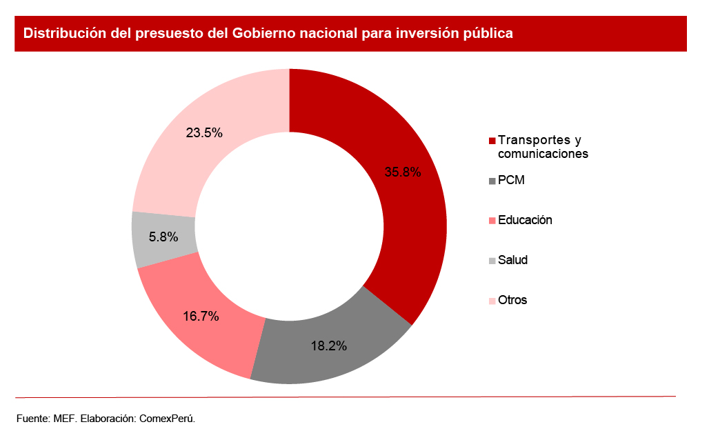 Esto es consecuencia del rezago en la ejecución de algunos sectores clave que concentran gran parte del presupuesto para inversión pública. Para tener una idea, a nivel del Gobierno nacional, cuatro sectores acumulan el 77% de este presupuesto. El sector transportes y comunicaciones cuenta con un presupuesto de S/ 9,220 millones; la Presidencia del Consejo de Ministros (PCM), S/ 4,688 millones; el sector educación, S/ 4,299 millones; el sector salud, S/ 1,502 millones; y otros sectores, S/ 6,040 millones[1].
