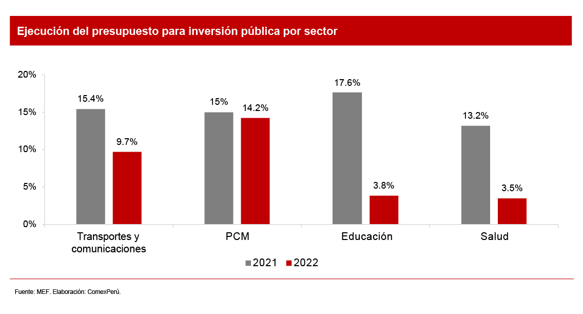 Entre enero y marzo de 2021, se alcanzó una ejecución del 15% del presupuesto destinado para proyectos de inversión pública; mientras que, en el mismo periodo de 2022, solo se alcanzó un 9% de ejecución, el menor porcentaje en los últimos cinco años.