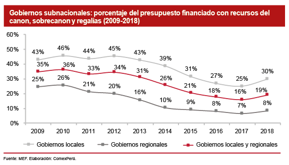 De acuerdo con cifras del portal de transparencia del MEF, en los últimos 10 años, los Gobiernos subnacionales en conjunto muestran que la participación del canon, sobrecanon y regalías en su presupuesto institucional modificado (PIM) destinado a actividades y proyectos ha venido disminuyendo sostenidamente desde 2012, en línea con las menores transferencias observadas de estos recursos. Así, entre 2009 y 2018, en promedio, este tipo de recursos representó un 26% del presupuesto de los Gobiernos subnacionales. Cabe resaltar que los montos presupuestados por canon, sobrecanon y regalías tienen mayor importancia a nivel de los Gobiernos locales; así, en el periodo analizado, representaron un 36% de su PIM, mientras que en los Gobiernos regionales representaron solo un 14%. Por otro lado, al analizar su nivel de avance, los Gobiernos subnacionales ejecutaron el 63.9%.