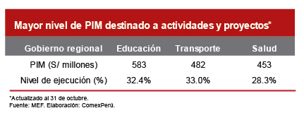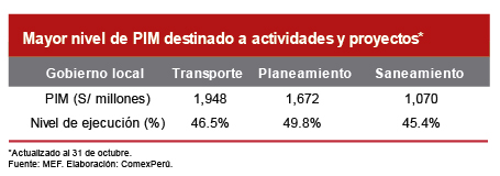 En lo que va del año, a nivel desagregado, en los Gobiernos locales, el mayor nivel de PIM fue destinado a actividades y proyectos de transporte, planeamiento y saneamiento; sin embargo, a tan solo dos meses de culminar el año, no llegan ni al 50% de la ejecución. De igual manera, con los Gobiernos regionales, el mayor nivel de PIM fue destinado a actividades y proyectos de educación, transporte y salud; no obstante, no llegan tampoco ni a la mitad del total.