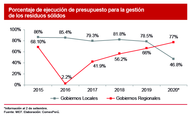En materia de ejecución del presupuesto para la gestión de residuos sólidos, se evidencia que, desde 2015, a excepción de 2018, el porcentaje de ejecución de los Gobiernos locales ha ido decreciendo, y a la fecha no supera el 50%. Entre los departamentos con menor ejecución municipal, se encuentran Apurímac (32.9%), Ayacucho (33.7%), Huancavelica (37.2%), Junín (37.9%) y Tacna (38.1%). Por otro lado, los Gobiernos regionales, desde 2016, evidencian un aumento en el porcentaje de ejecución del presupuesto, que a la fecha alcanzaría el 77% de ejecución.