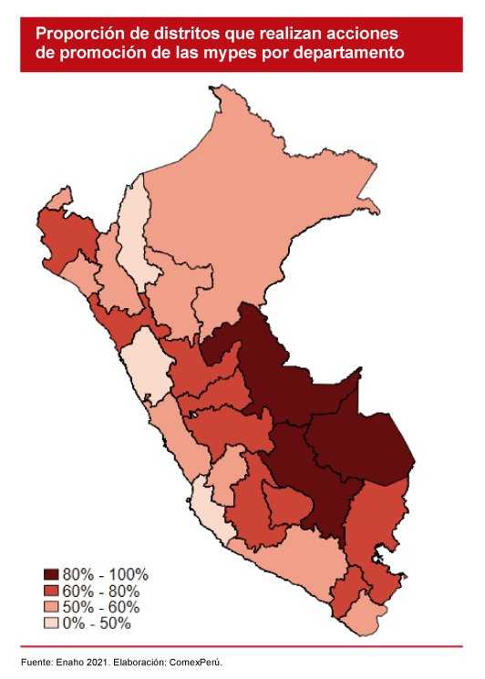 En 2021, el 62.4% de municipalidades realizaron al menos un tipo de acción para incentivar el comercio de las micro y pequeñas empresas en su territorio. Entre los departamentos con mayor porcentaje de municipalidades con al menos una actividad realizada se encuentran Cusco (98.2%), Ucayali (88.2%), la provincia constitucional del Callao (85.7%), Madre de Dios (81.8%) y Piura (78.5%); mientras que Amazonas (28.6%), Áncash (38%), Ica (39.5%), Lima (52.6%) y Cajamarca (53.5%) son los que realizan menos actividades de promoción dirigidas a las mypes.