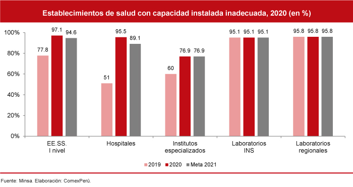 En cuanto al estado de los hospitales, de los 247 contabilizados a nivel nacional al cierre de 2020, 236 tienen capacidad instalada inadecuada. En términos proporcionales, el incremento de infraestructura inadecuada entre 2019 y 2020 habría pasado del 51% al 95.5%. Esta brecha se explicaría por el colapso sanitario que originó el incremento sustancial de las atenciones a pacientes con coronavirus. A nivel desagregado, los departamentos con menores indicadores de brecha de infraestructura y equipamiento en estos establecimientos son Tumbes (67%), San Martín (70%), Moquegua (75%) e Ica (89%).
