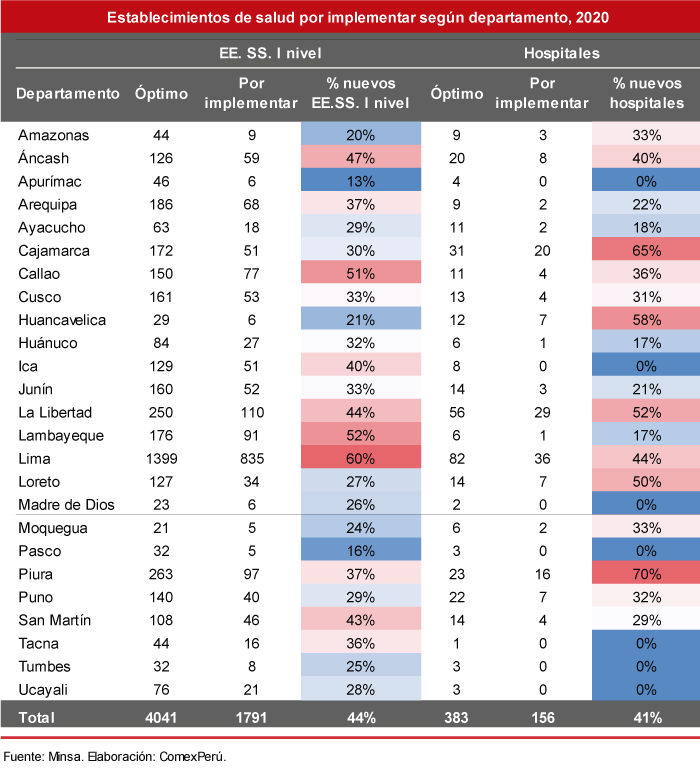 De acuerdo con el referido reporte, nuestro país presenta una brecha de 1,791 centros del primer nivel de atención, es decir, un 44% para contar con el óptimo de 4,041 requeridos. En términos proporcionales, los departamentos con mayor requerimiento de nuevos establecimientos son Lima (60%), Lambayeque (52%) y Callao (51%), que a la fecha cuentan con menos de la mitad de los establecimientos necesarios para ofrecer el servicio adecuadamente. De igual forma, por el lado de los hospitales, el país requiere 156 para alcanzar la cantidad óptima estimada de 383 y los departamentos con mayor brecha respecto del óptimo son Piura (70%), Cajamarca (65%) y Huancavelica (58%).