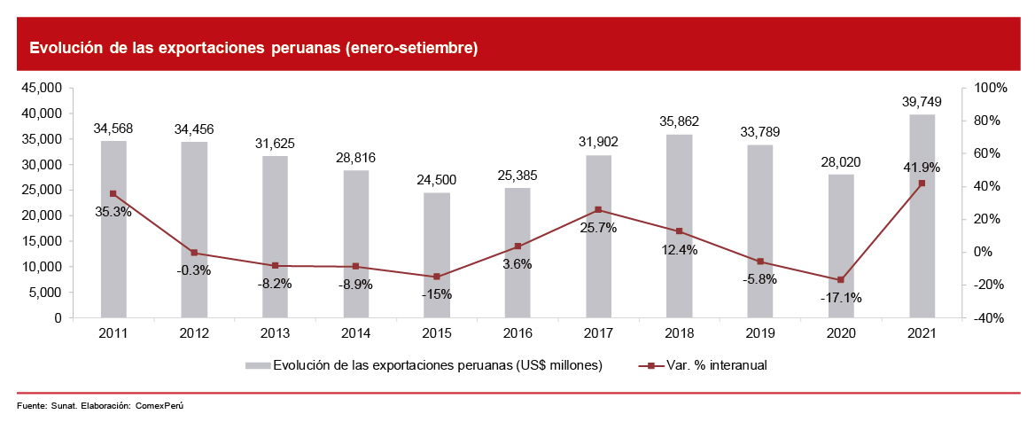 Las exportaciones totales entre enero y setiembre de 2021 registraron un valor de US$ 39,749 millones, según la Sunat. Esta cifra representa un crecimiento del 41.9% con respecto al mismo periodo de 2020. Cabe mencionar que, al tercer trimestre de 2020, nuestras exportaciones se redujeron un 17.1%, mientras que los resultados para el mismo periodo de 2019 y 2018 tuvieron variaciones interanuales del -5.8% y el 12.4%, respectivamente.