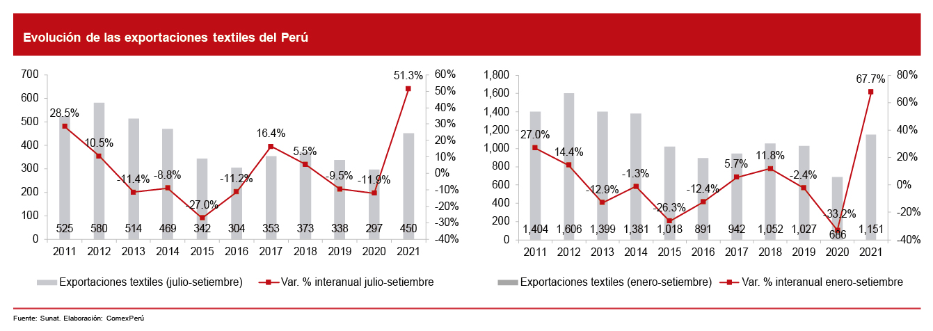 EL AUMENTO DEL 67.7% EN LAS EXPORTACIONES TEXTILES ENTRE ENERO-SETIEMBRE DE 2021 COINCIDE CON LA SÓLIDA RECUPERACIÓN DEL COMERCIO EXTERIOR PERUANO