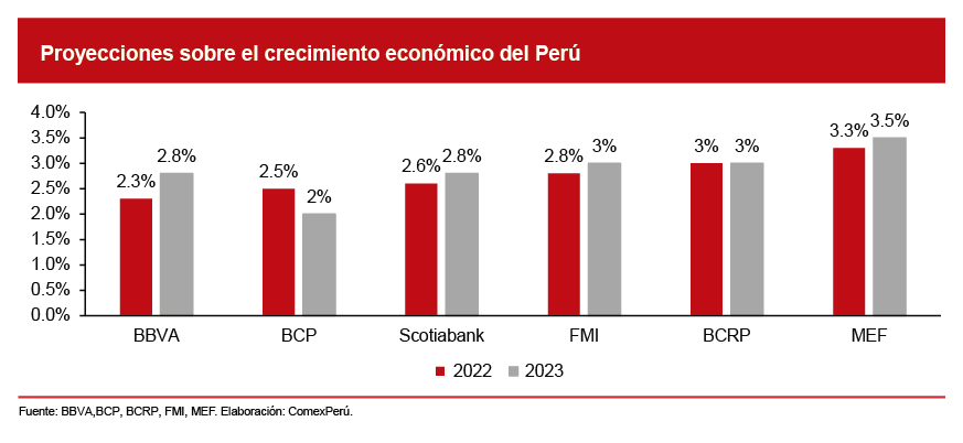 Asimismo, otras entidades bancarias presentaron sus proyecciones de crecimiento económico peruano para este y el próximo año. Por ejemplo, el Banco de Crédito del Perú (BCP) espera que la economía crezca un 2.5% al finalizar el año; Scotiabank, un 2.5% y el BBVA, un 2.3%. Por su parte, según las proyecciones del Marco Macroeconómico Multianual 2023-2023, presentadas por el Ministerio de Economía y Finanzas, señala que la economía peruana crecerá 3.3% en 2022 y, en julio, el Fondo Monetario Internacional (FMI) manifestó que la economía en el presente año crecería un 2.8%.