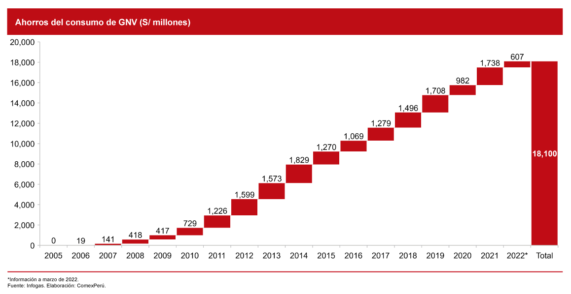 Hoy en día, una de esas alternativas es el gas natural, que se utiliza como una fuente de energía relativamente más económica frente a los derivados del petróleo. Por ejemplo, entre 2005 y marzo de 2022, el consumo de gas natural vehicular (GNV) frente a otros combustibles ha generado un ahorro de aproximadamente S/ 18,100 millones, según Infogas[1]. Pero que este recurso sea una alternativa viable para cualquier ciudadano no es algo que se pueda lograr de la noche a la mañana, sino que necesita de un aparato productor detrás, el cual, para ser desarrollado, requiere tiempo (he ahí el mediano y largo plazo).