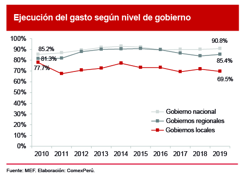 En las últimas décadas, hemos sido testigos de los alentadores resultados de un modelo económico basado en la apertura al comercio exterior, el fomento de la inversión privada y el impulso de la competitividad. No obstante, también hemos visto que este crecimiento económico no ha venido acompañado por una adecuada y oportuna gestión de los recursos en todos los niveles de gobierno, la misma que resulta crítica si observamos los resultados de los Gobiernos locales a nivel departamental. En ese sentido, un indicador aproximado del débil desempeño de las autoridades subnacionales es el bajo nivel de ejecución del gasto que han demostrado en los últimos años, basta con ver que a nivel de gobiernos locales esta no supera siquiera el 80%.