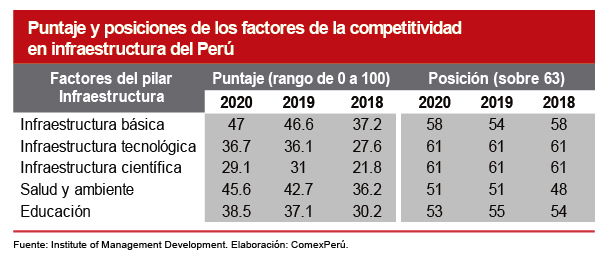 Si bien este año logramos escalar tres posiciones con respecto al año anterior, los resultados no son del todo alentadores si observamos el puntaje obtenido, el cual cayó de 57.2 a 54.9 (sobre 100 puntos). Esta variación negativa se explica por un menor registro en los pilares desempeño económico e infraestructura. Este último, que analiza el grado en que los recursos básicos, tecnológicos, científicos y humanos satisfacen las necesidades de los empresarios, resulta más alarmante, ya que nos ubicamos en los últimos lugares entre todos los países evaluados (puesto 60). El bajo desempeño de la inversión en infraestructura evidencia nuestra debilidad en cuanto al desarrollo de ciencia y tecnología, en educación y, principalmente, en salud y ambiente. Y los costos de esta baja inversión se reflejan en la limitada capacidad de respuesta que tenemos ante la COVID-19.