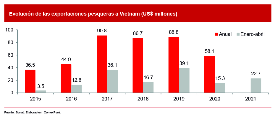 De acuerdo con PromPerú, Vietnam se caracteriza por un elevado consumo de productos pesqueros y registra la tercera mayor densidad poblacional del sudeste asiático (96.5 millones de habitantes en 2019, según el Banco Mundial). Respecto de su relación con nuestro país, se ubicaba como el séptimo destino más importante para nuestras exportaciones pesqueras prepandemia, con US$ 88.9 millones, aunque el año pasado se posicionó como el décimo, con US$ 58.1 millones, lo que representa una contracción del 34.5% con respecto a 2019.