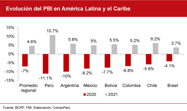 Respecto de la región, el Perú sería una de las economías con mejor desempeño para este año, pues para América Latina y el Caribe se espera un crecimiento del 4.6%. No obstante, esto también se explicaría por la severidad de la contracción registrada en 2020, la cual también sobresalió en nuestro país; tanto es así que, a pesar del mejor desempeño, el BCRP estima que recién para finales del presente año o, en su defecto, en el primer trimestre de 2022, recién se recuperaría completamente el PBI. Cabe resaltar que, si bien Argentina (-10%) y México (-8.2%) también cayeron considerablemente, en 2021 enfrentaría una recuperación más moderada con un 5.8% y un 5%, respectivamente; mientras que Chile alcanzaría un 6.2% a pesar de que su actividad económica no fue tan perjudicada por la pandemia.