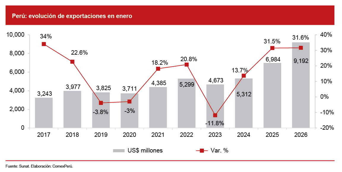 Las exportaciones peruanas arrancaron 2026 con un crecimiento notable (+31.6% en enero). Aun así, el contexto global advierte que sostener este desempeño en los siguientes meses no será tarea sencilla.