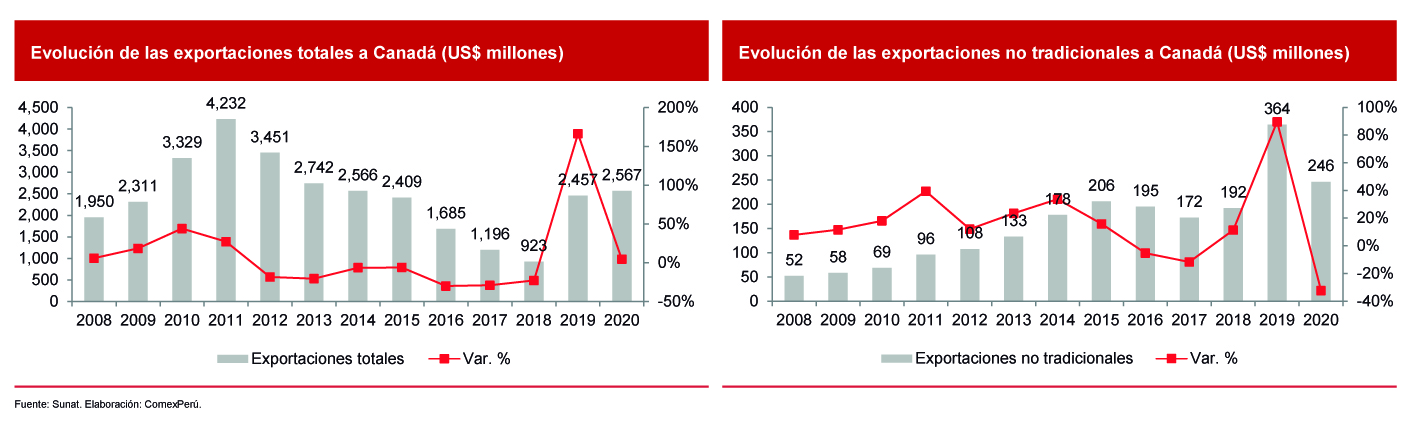 Entre 2009 y 2020, nuestras exportaciones a Canadá sumaron US$ 29,868 millones, con un crecimiento promedio anual del 1% durante dicho periodo, de acuerdo con cifras de la Sunat. Si bien las exportaciones tradicionales representaron el 93.2% del total de los envíos desde que entró en vigor el TLC, las no tradicionales han evidenciado un crecimiento promedio anual del 14%, al pasar de US$ 58 millones en 2009 a US$ 246 millones en 2020. No obstante, antes de la pandemia, el crecimiento promedio anual de las exportaciones no tradicionales a Canadá fue del 20.1% entre 2009 y 2019. De esta forma, los productos asociados al rubro no tradicional han sido los más beneficiados gracias al acuerdo, tal como debería ser.