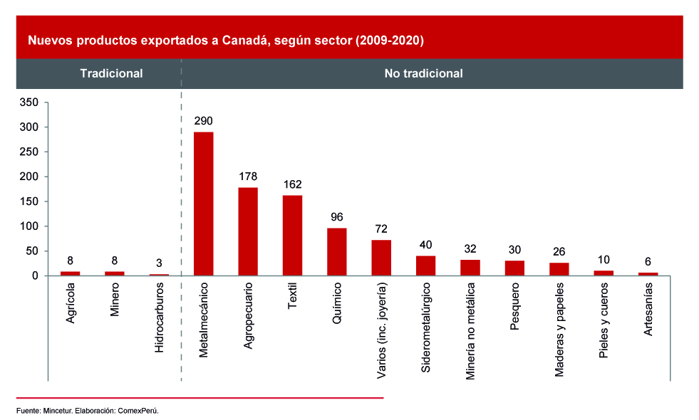 Cabe resaltar que los beneficios del TLC también se han visto reflejados en el número de nuevos productos exportados a Canadá. Según cifras del Ministerio de Comercio Exterior y Turismo (Mincetur), desde 2009, se registraron 961 nuevos productos exportados a Canadá, de los cuales 942 pertenecen al rubro no tradicional (98%). Entre los principales sectores beneficiados por el acuerdo se encuentran el metalmecánico, con 290 nuevos productos exportados (30.2% del total); el agropecuario, con 178 (18.5%); y el textil, con 162 (16.9%).