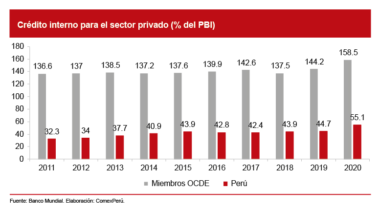 En 2020, según datos del Banco Mundial, el crédito para el sector privado como porcentaje del PBI fue del 55.1%. En esta línea, es importante fomentar el acceso al crédito y la competitividad en el sector financiero, a fin de lograr mejores tasas de interés que impulsen el crecimiento económico; pero ello debe ir de la mano con garantizar una deuda sostenible en el tiempo, que evite el sobreendeudamiento y el riesgo de impago.