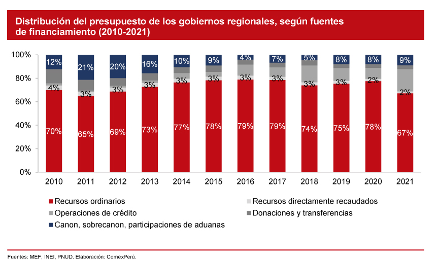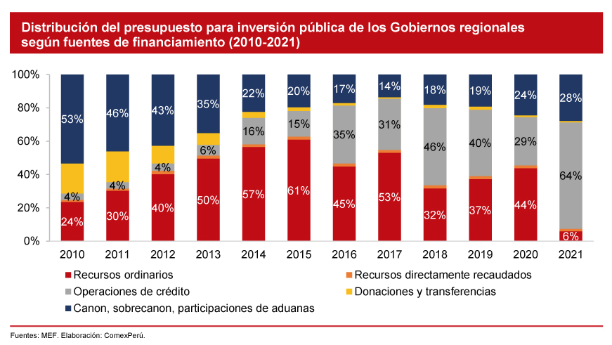 En 2021, los Gobiernos regionales recibieron un presupuesto de S/ 45,287 millones en total, de los cuales el 67% se financió con recursos ordinarios; el 19%, con deuda, y un 9%, con ingresos derivados de la explotación de recursos. En cuanto al presupuesto para inversión pública, este sumó S/ 10,019 millones, de los cuales el 64% fue financiado con deuda y el 28%, con recursos de canon, sobrecanon y regalías.