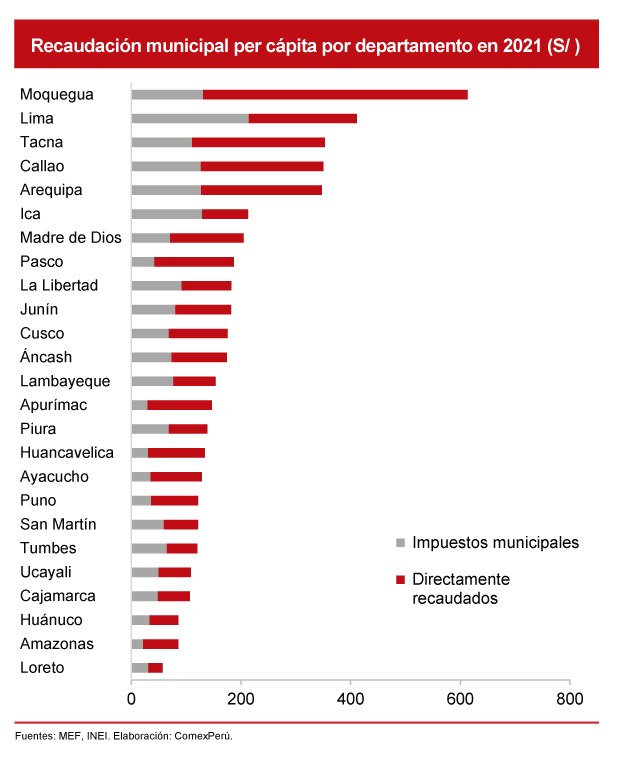 Al evaluar el nivel de recaudación municipal per cápita por departamentos, las diferencias son amplias. En promedio, los Gobiernos locales recaudaron S/ 253 por habitante en 2021. Por ejemplo, mientras que Moquegua alcanzó una recaudación per cápita de S/ 613, Loreto solo recaudó S/ 53.