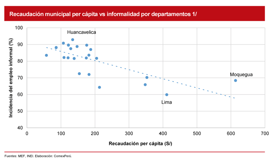De acuerdo con el estudio Panorama de las relaciones fiscales entre niveles de gobierno de países de América Latina y el Caribe, del Banco Interamericano de Desarrollo y la CEPAL, en el Perú existe una oportunidad de mejora en la recaudación de impuestos fiscales. Por ejemplo, para el caso del impuesto predial, en el país este explica el 0.3% del PBI, mientras que en Chile y Colombia supera el 0.5%, y en los países de la OCDE equivale al 1.1%.