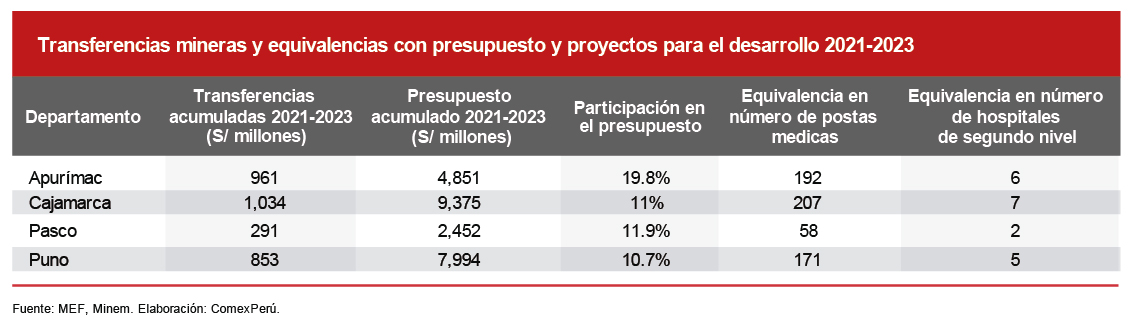 Entre 2021 y 2023, las transferencias por conceptos mineros que recibió Cajamarca ascendieron a S/ 1,034 millones. Esto representó un 11% del presupuesto acumulado para la inversión pública durante el mismo periodo. Así, los Gobiernos regionales y municipalidades pudieron haber construido 207 postas médicas y 7 hospitales de segundo nivel adicionales.