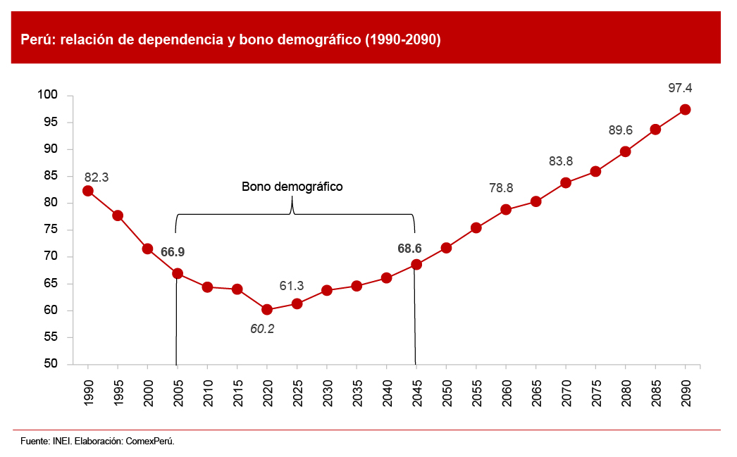 El bono demográfico se calcula dividiendo la cantidad de población dependiente sobre la cantidad de población económicamente activa en un país. Cuando existen menos de dos dependientes por cada tres personas en edad activa (es decir, un ratio igual o menor a 66.7), se considera que existe bono demográfico. En el Perú, según el INEI, este se inició alrededor de 2005, alcanzó su punto álgido en 2020 y acabaría aproximadamente en 2045. Esto se debe a la reducción en las tasas de natalidad, junto con el aumento en la esperanza de vida.