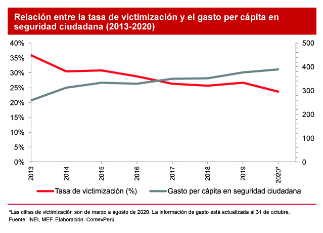 La paradoja entre la percepción de la inseguridad ciudadana y la tasa de victimización es uno de los problemas que más relevancia ha tenido en los últimos años. En el gráfico, se analiza la evolución del gasto público per cápita en seguridad ciudadana y su relación con la tasa de victimización entre 2013 y 2020. Se aprecia que, mientras que la proporción de la población víctima de la delincuencia cayó 12 puntos porcentuales, el gasto per cápita en seguridad ciudadana creció alrededor de 50% (de S/ 260 a S/ 390 en el periodo analizado).