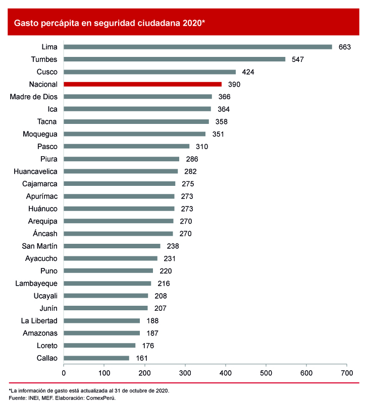 La reducción de la victimización ha estado acompañada de un aumento del presupuesto y el gasto público en orden interno y seguridad. Entre 2011 y 2020[2], el presupuesto creció a una tasa promedio anual del 8%, al pasar de S/ 7,900 millones a S/ 12,700 millones en el periodo analizado. Asimismo, en octubre de 2020, a nivel departamental, Lima mostró el mayor gasto por habitante (S/ 663), seguida por Tumbes (S/ 547) y Cusco (S/ 424). Por otro lado, los departamentos con el menor gasto por habitante son Amazonas (S/ 187), Loreto (S/176) y Callao (S/ 161).