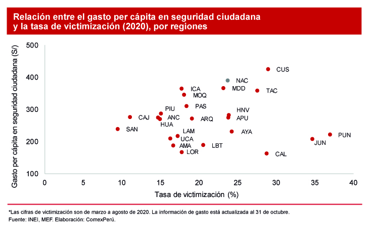 No obstante, al analizar en conjunto el incremento del gasto per cápita por departamentos y la tasa de victimización, se observa claramente una relación entre mayor gasto y mayores víctimas de algún delito. De hecho, una comparación simple muestra una relación positiva entre más gasto y mayor incidencia de la delincuencia, lo que se explicaría por una mejor asignación de recursos a nivel regional, con excepción de Lima y Tumbes, donde no se evidencia una relación clara.