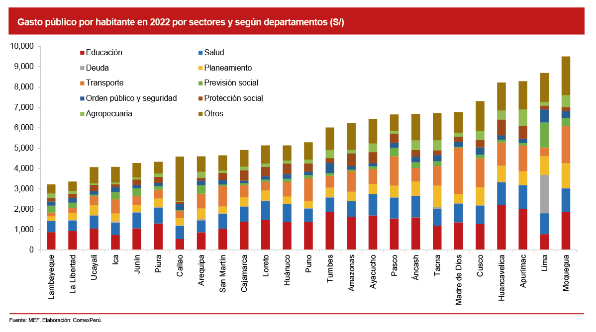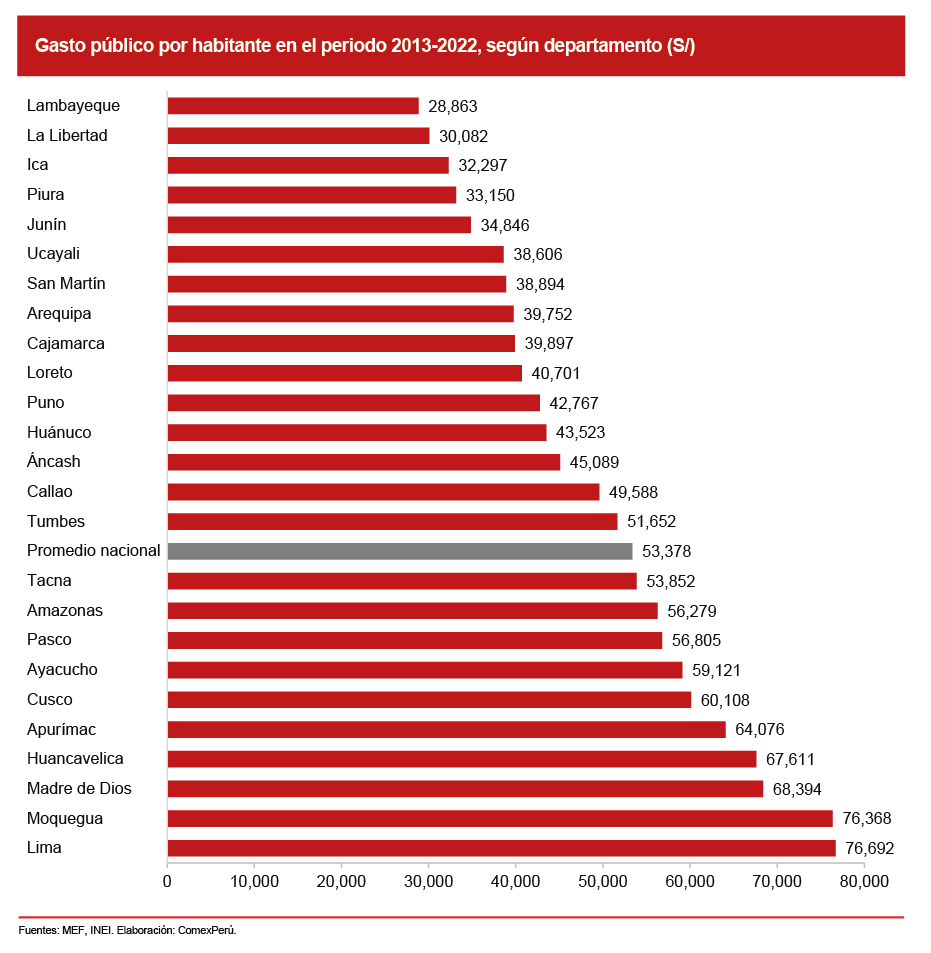 No obstante, tal como se mencionó, las diferencias son amplias entre departamentos. Por ejemplo, en Moquegua, el gasto público por persona fue 2.6 veces más que el de Lambayeque en la última década. Y en 15 departamentos el gasto por habitante fue menor que el promedio nacional.