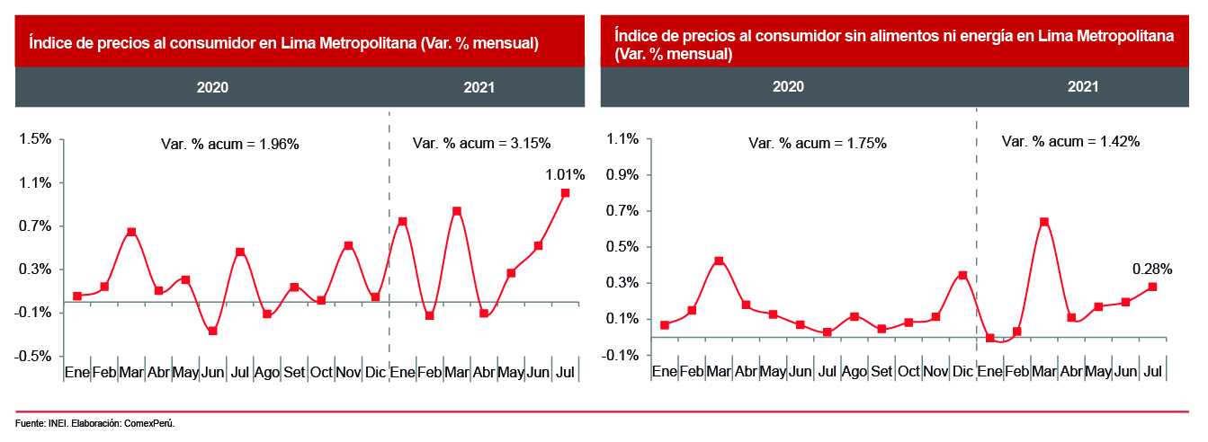 Desde el mes de mayo, se han evidenciado aumentos constantes y crecientes en el índice de precios al consumidor (IPC). Así, en julio de 2021, se reportó un incremento del IPC en Lima Metropolitana del 1.01% con respecto al mes de junio, con lo que acumula un crecimiento del 3.15% en los primeros siete meses del año, según el Instituto Nacional de Estadística e informática (INEI).