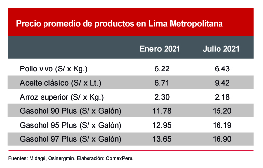 El aumento en los precios de los productos que componen el IPC se ha visto afectado a lo largo del año por distintos motivos. En el reporte de inflación de junio de 2021, el Banco Central de Reserva del Perú (BCRP) indicó que las principales razones que estarían impulsando el alza de los precios serían aquellas asociadas con la oferta agregada, específicamente el aumento en los precios de los combustibles, los commodities y el tipo de cambio. Esto último estaría ligado a las expectativas negativas de las empresas y los ciudadanos ante la incertidumbre económica, política y social, la cual es agravada por problemas políticos ocasionados por los serios cuestionamientos a varios miembros del gabinete Bellido.