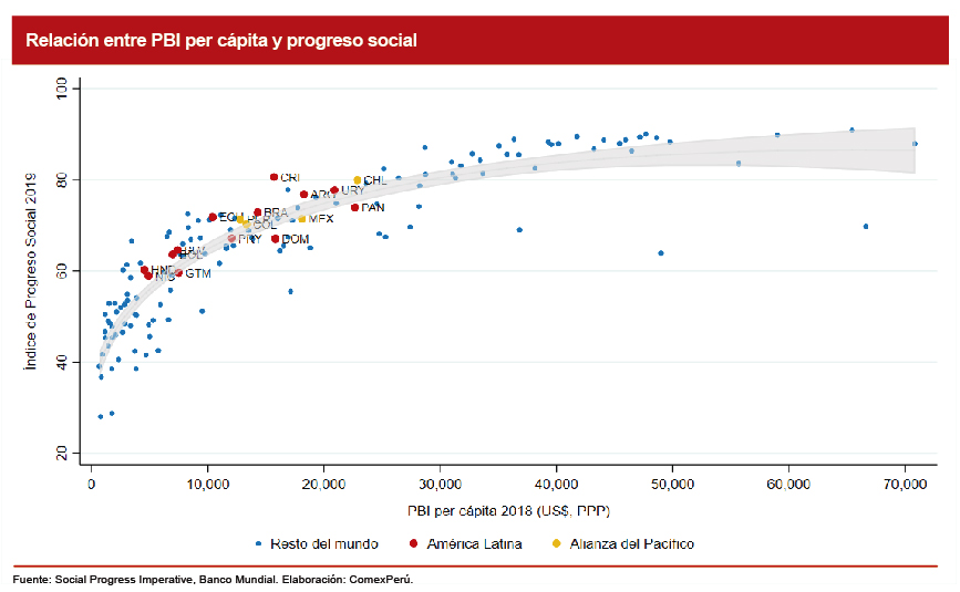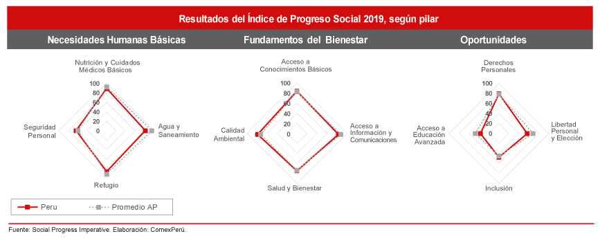 Los resultados del IPS 2019 muestran que el Perú ocupa la posición 57 entre 149 países, con un puntaje de 71.3, y se clasifica en la categoría de Progreso Social Medio Alto, junto con países como Chile (puesto 37), Uruguay (41), Argentina (42), Brasil (49), México (55) y Colombia (60). En términos del ranking, según pilares, el Perú alcanzó el puesto 85 en Necesidades humanas básicas, con 80.1 puntos; el puesto 41 en Fundamentos del bienestar, con 78.6 puntos, y el puesto 61 en Oportunidades, con 55.2 puntos. Desde 2014, nuestro país ha mejorado su puntaje en los primeros dos pilares, con un 5% en cada uno, mientras que el último se ha estancado, principalmente por el retroceso de los componentes Libertad personal y elección (el cual incluye corrupción y empleo), e Inclusividad (que incluye discriminación de minorías y equidad de poder político).