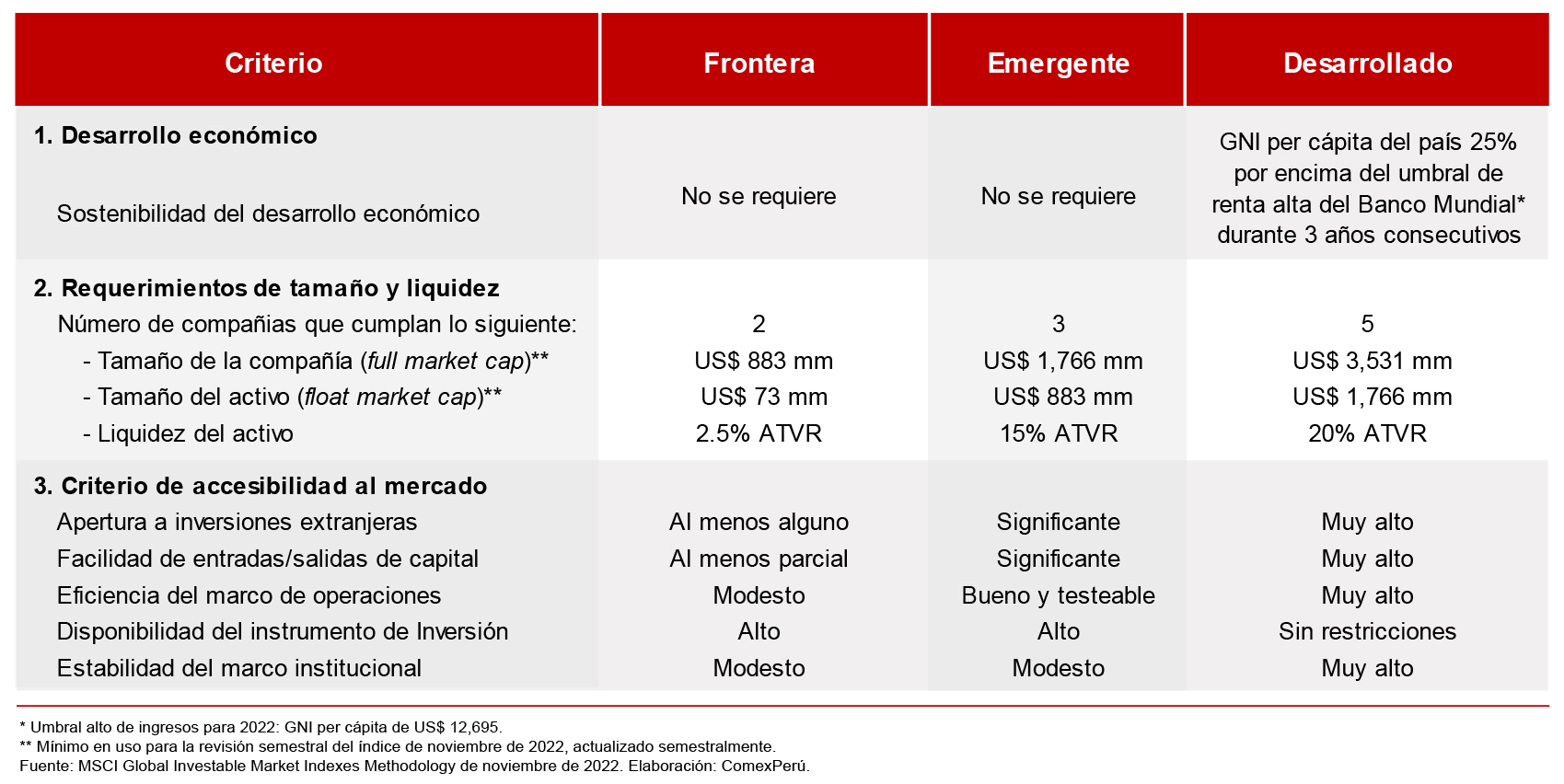 Como se observa en la tabla, la clasificación de mercados de MSCI consta de tres principales criterios mínimos: desarrollo económico, tamaño y liquidez, y accesibilidad al mercado. Solo existen tres categorías: i) desarrollado; ii) emergente; y iii) frontera, aquellos países que no están en ninguno de estos son conocidos como standalone. Cabe mencionar que cada cierto tiempo se evalúa la clasificación de los países, de tal manera que los índices reflejen de la forma más clara y actualizada posible la situación real de los mercados financieros.