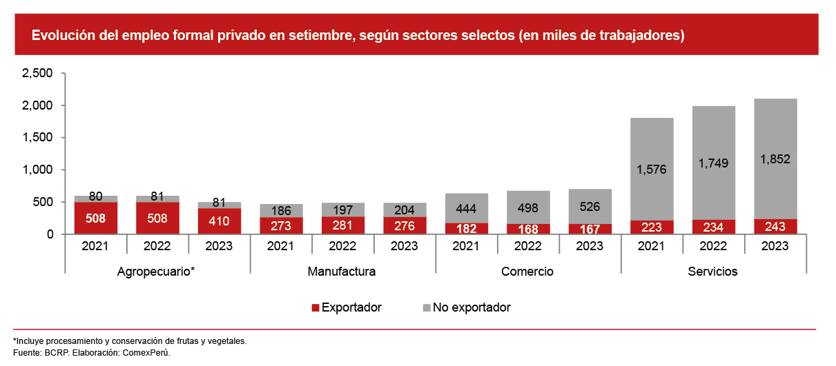 De acuerdo con estimaciones del BCRP, las exportaciones representaron cerca del 30% del PBI peruano durante los últimos años y mantienen una participación similar en la generación de empleo formal. En detalle, en septiembre, se registraron 1.2 millones de empleos formales en empresas exportadoras, los cuales representaron el 28.8% del empleo formal a nivel nacional; esto representó una ligera reducción respecto del 31.5% reportado en el mismo mes de 2022. Las empresas exportadoras se caracterizan por tener mayores niveles de productividad y mejor capacidad de gestión logística, de manera que una mayor participación de estas podría significar más competitividad en el sector, pero ello no ocurre con el sector agropecuario.
