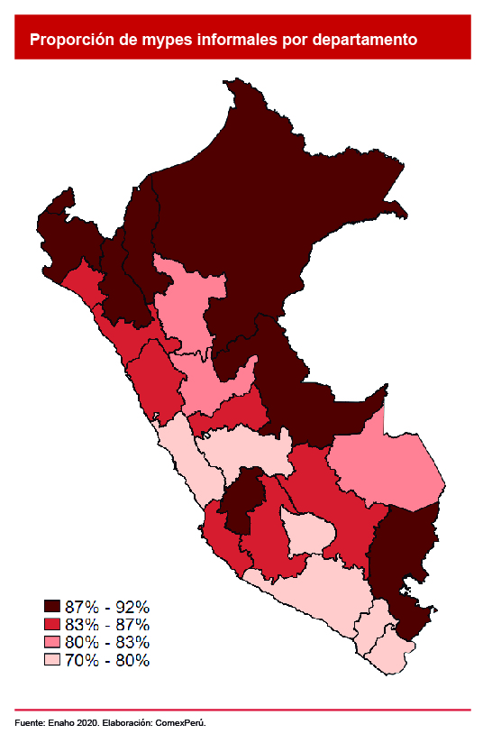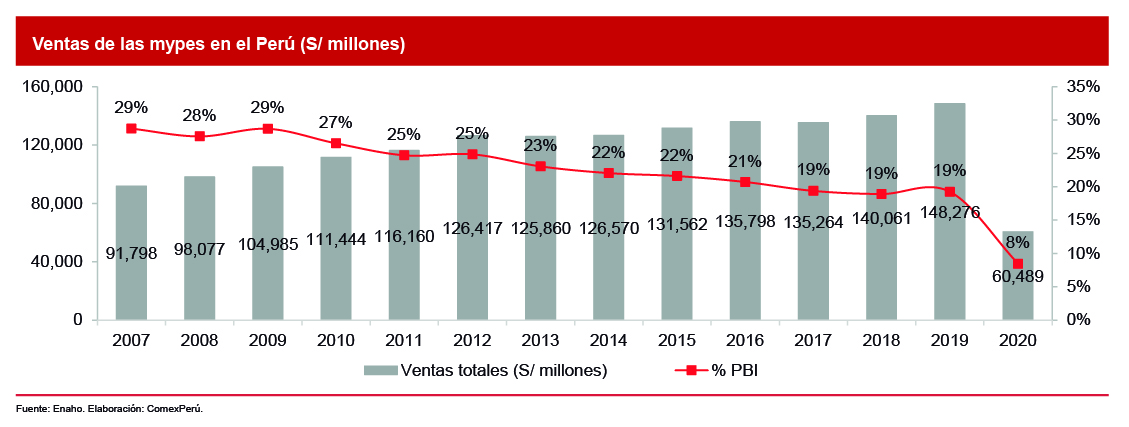 De acuerdo con cifras de la Encuesta Nacional de Hogares (Enaho) en 2020, publicada por el INEI, el sector privado peruano está conformado principalmente por micro y pequeños negocios. A raíz de la crisis causada por la pandemia, las mypes fueron severamente afectadas. Así, en 2020, se registraron aproximadamente 3.1 millones de mypes distribuidas a lo largo del territorio nacional, un 48.8% menos que en 2019. Esto demuestra el gran impacto dentro del rubro empresarial, pero también revela un mecanismo de transmisión de la crisis económica hacia los hogares que subsistían con los ingresos generados por las mypes.