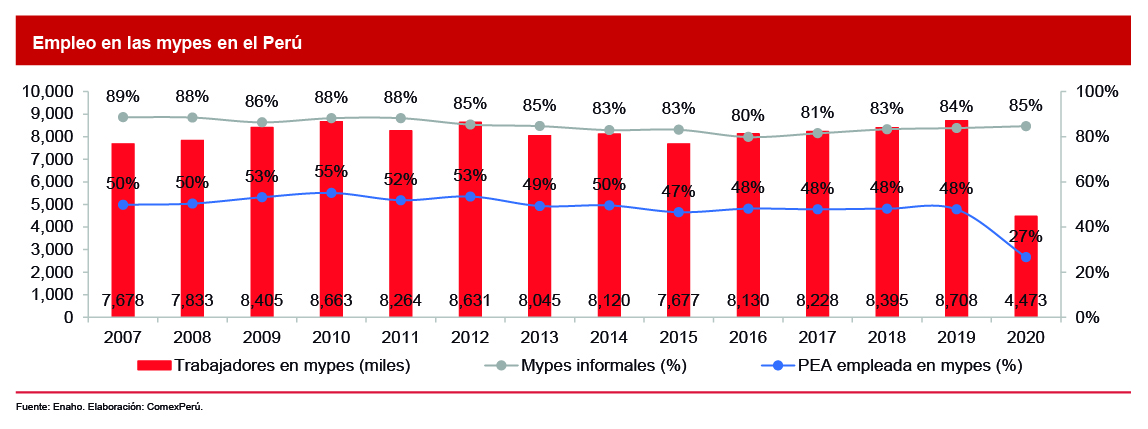 De acuerdo con cifras de la Enaho, las mypes emplearon a 4.5 millones de trabajadores en 2020, un 48.6% menos que en el año anterior. Este nivel de empleo representa, aproximadamente, un 26.6% de la población económicamente activa (PEA) en el país. Es decir, en 2020, casi una de cada cuatro personas que participaron en el mercado laboral trabajaron en una mype. Esto significó una reducción de 21.2 pp en el porcentaje de la PEA que laboraba en una mype, lo cual se explicaría por el cierre masivo de negocios y la reducción tanto en la productividad como en demanda.