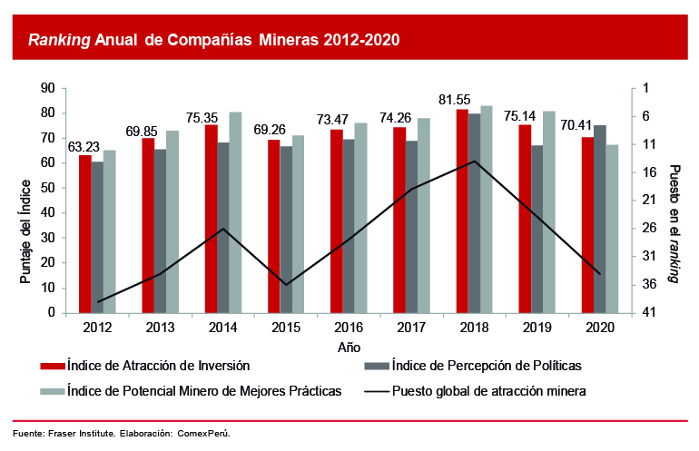El valor del Índice de Atracción de Inversión para el Perú en 2020 fue de 70.4, inferior al 75.1 alcanzado el año previo y 11.1 puntos debajo del valor alcanzado en 2018, que además fue el más alto en estos últimos 9 años. En cuanto al Índice de Percepción de Políticas, el 75.2 alcanzado se convirtió en el segundo valor más alto para Perú, luego del 79.7 obtenido en 2018. Por el lado del índice de Potencial Minero de Mejores Prácticas, la calificación fue de 67.2, el segundo valor más bajo desde 2012, año en el que se puntuó 65.2.