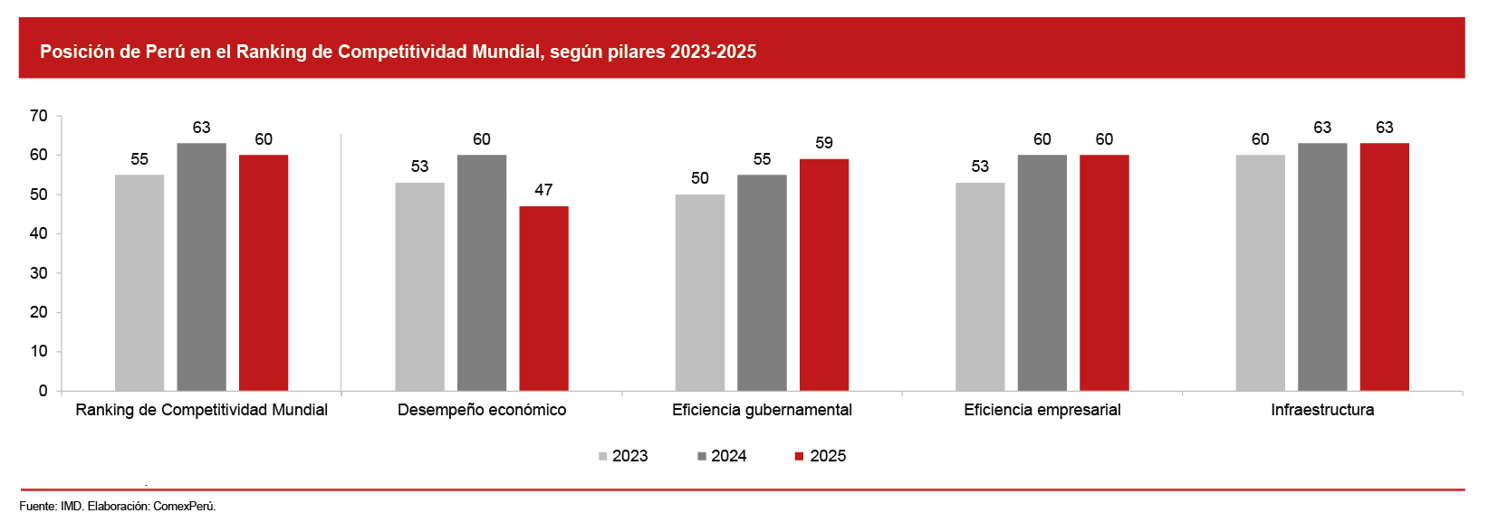 El Ranking de Competitividad Mundial, elaborado por el Instituto Internacional para el Desarrollo Gerencial (IMD, por sus siglas en inglés), evalúa las condiciones que determinan la capacidad de los países para sostener un desarrollo económico sólido y sostenible en materia política, económica y social. En su edición 2025, el Perú se posicionó en el puesto 60 de 69 economías evaluadas. Si bien subió tres posiciones respecto del año anterior, continúa ubicado en las últimas posiciones. ¿Qué está frenando nuestra competitividad?