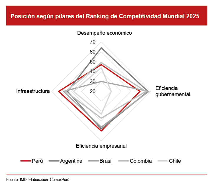 En el ámbito de la eficiencia gubernamental, el retroceso fue generalizado en todos sus componentes, lo que refleja una débil contribución de la política pública a la mejora de la competitividad en nuestro país. La legislación empresarial fue el factor más afectado, con una caída de cuatro puestos. Aún más preocupante es la ubicación del componente de marco social referido a problemas de crecimiento sostenible y seguridad, en el puesto 62, la posición más baja dentro de este pilar. Ante este deterioro, el IMD enfatiza la importancia de que los sectores público y privado trabajen de manera conjunta para sostener la competitividad, especialmente en un entorno internacional cada vez más fragmentado.