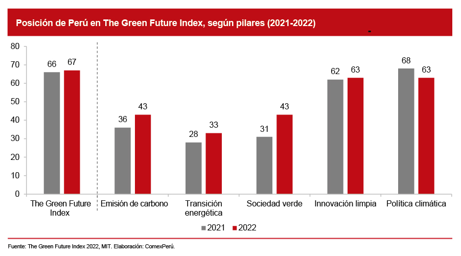 De acuerdo con cifras del índice, el Perú ocupó la posición 67 en la última edición. Este resultado significa el retroceso en una posición con respecto a la edición de 2021. En términos de los pilares que componen este indicador, el país ocupa sus mejores posiciones en los pilares de Emisión de carbono (puesto 43), Transición energética (puesto 33) y Sociedad verde (puesto 43); sin embargo, en estos tres se evidencia un rezago de competitividad, dado sus retrocesos con respecto a la edición anterior. Por el contrario, el Perú se encuentra significativamente rezagado en los pilares de Innovación limpia (puesto 63) y Política climática (puesto 63).