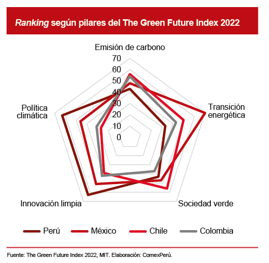 Dada esta realidad, es necesario el monitoreo de los avances de las economías respecto de su preparación para afrontar el cambio climático y adaptar su matriz energética, reducir las emisiones de gases de efecto invernadero y generar políticas de largo plazo que incentiven el cambio en comportamientos e inversión. De esta manera, el Massachusetts Institute of Technology presenta los resultados de The Green Future Index 2022, el cual, en su segunda edición, muestra el progreso que 76 economías han tenido en términos de su preparación para un futuro sostenible. Este índice está compuesto por cinco indicadores: i) emisión de carbono, ii) transición energética, iii) sociedad verde, iv) innovación limpia, iv) política climática.