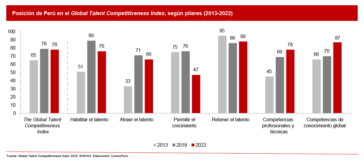 De acuerdo con cifras del índice, el Perú ocupó la posición 78 de 133 países en la última edición. Este resultado significa un avance en nueve posiciones con respecto a la edición de 2021. En términos de los pilares que componen este indicador, el país ocupa sus mejores posiciones en los pilares Permitir el crecimiento (puesto 47) y Atraer el talento (puesto 66). Estos dos resultados evidencian una mejora con respecto a la edición anterior. Por otro lado, el Perú se encuentra significativamente rezagado en los pilares de Habilitación (puesto 76), Competencias profesionales y técnicas (puesto 78), Competencias de conocimiento global (puesto 87) y Retener el talento (puesto 88).