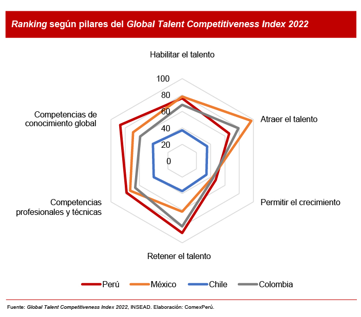 Al comparar los resultados del Global Talent Competitiveness Index del Perú, frente a sus pares en América Latina (especialmente frente a los países miembros de la Alianza del Pacífico), observamos que los pilares Retener el talento, Competencias profesionales y técnicas, y Competencias de conocimiento global son los principales puntos en los que evidenciamos desventajas. Por ejemplo, Chile y Colombia ocupan las posiciones 37 y 80, respectivamente, en el pilar Retener el talento; 40 y 66, respectivamente, en el pilar Competencias profesionales y técnicas; y 41 y 59, respectivamente, en el pilar Competencias de conocimiento global.