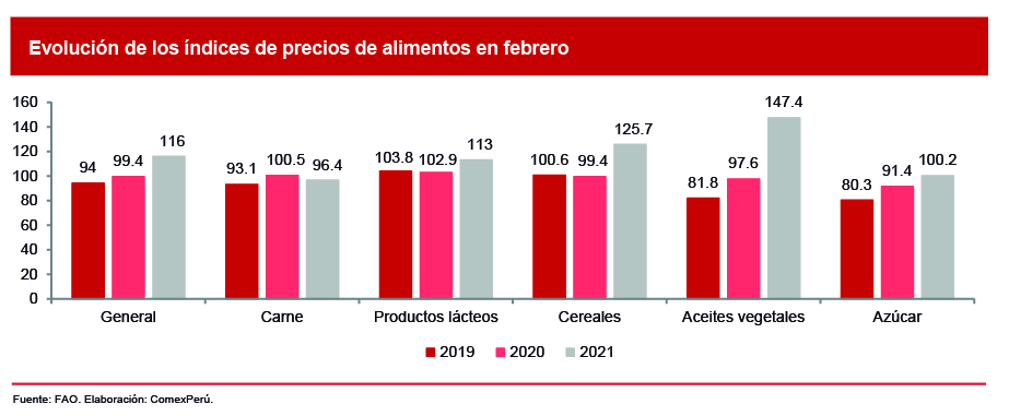 Respecto de esto último, el índice de precios de los alimentos de la Organización de las Naciones Unidas para la Alimentación y la Agricultura (FAO, por sus siglas en inglés) promedió 116 puntos en febrero del presente año, un 16.7% más que en el mismo mes de 2020, lo que constituye el valor más alto desde julio de 2014 y el noveno mes consecutivo de alza. Esta situación se explicaría por el incremento significativo en la mayoría de los subíndices, pues en el de aceites vegetales se registró un aumento interanual del 51% tras alcanzar los 147.4 puntos, seguido por los cereales (125.7 puntos; +26.5%), los productos lácteos (113 puntos; +9.9%) y el azúcar (100.2 puntos; +9.5%). Es decir, únicamente el índice de precios de la carne se redujo en el periodo, tras descender a los 96.4 puntos (-4%), aunque desde setiembre mantiene también una tendencia al alza.