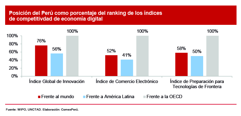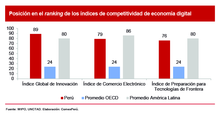 En cuanto a los resultados para algunas variables clave que componen el análisis de competitividad de economía digital, se encuentra que el Perú demuestra las mayores falencias en el uso extensivo de tecnologías de la información y las comunicaciones (puesto 102 a nivel mundial), y sofisticación de las industrias (puesto 134); esto se vincula también a un rezago en términos de la productividad tecnológica de las empresas, según el Índice de Innovación Global.