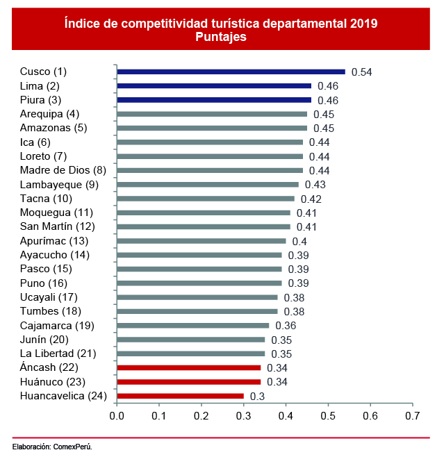 A nivel nacional, según los resultados del Índice de competitividad turística departamental (ICTD) del Informe Anual de Desempeño y Competitividad Turística - Resultados en 2019, elaborado por ComexPerú, Cusco lidera el ranking, lo que sugiere que este departamento cuenta con una importante ventaja en los indicadores que componen los pilares de competitividad. En el segundo y tercer lugar se encuentran Lima y Piura, respectivamente, mientras que los tres últimos lugares los ocupan Áncash, Huánuco y Huancavelica.